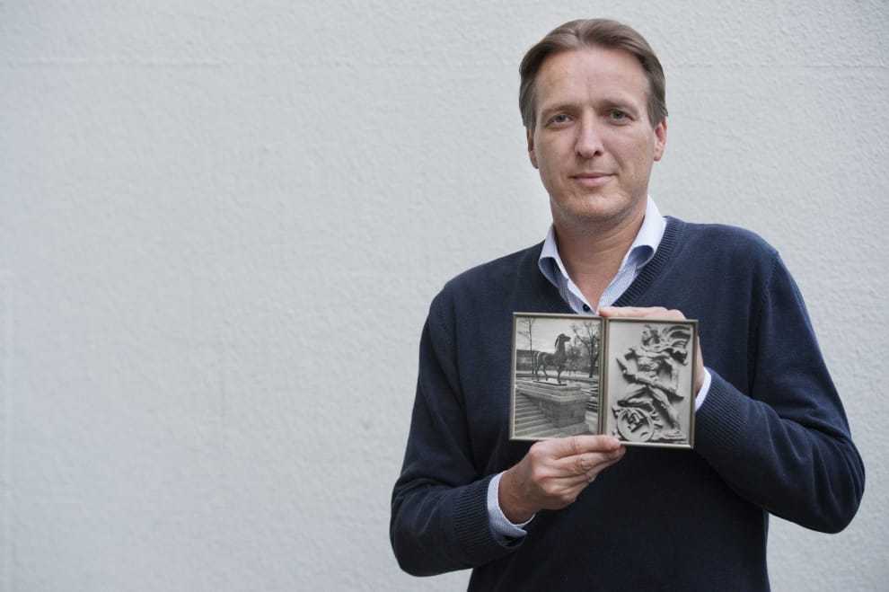 圖為有「藝術界印第安那瓊斯」之稱的荷蘭藝術偵探布蘭德,他手上拿著找回的希特勒(Adolf Hitler)時期德國總理府雕像照片。