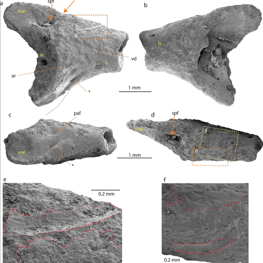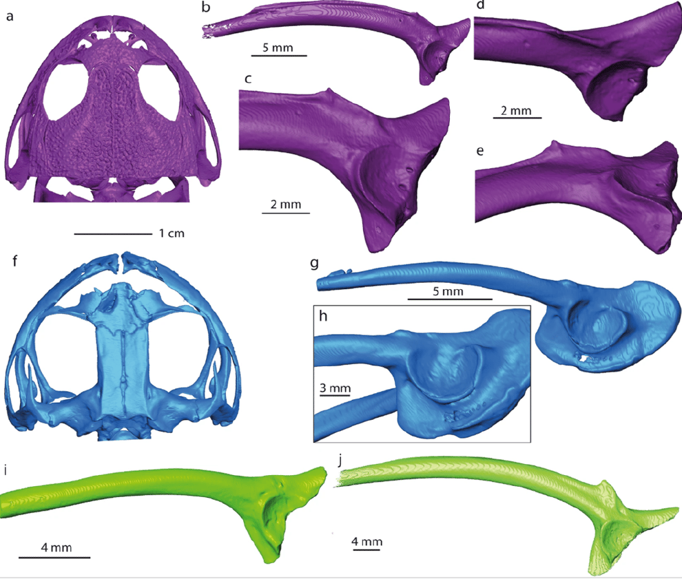 網友Thomas Mörs et al.摩爾斯博士將挖掘到的髂骨和其他幾種現存青蛙的髂骨進行比較,圖中b–e、g–j標示的骨骼,皆為現存青蛙髂骨的 3D模型。