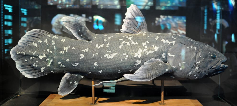 圖為博物館重建出的腔棘魚模型。古生物學家認為,當時生活在河流中的各種大型魚類,足以供應多種大型掠食動物生存在同一個區域,是這次出土許多大型掠食動物的可能原因。