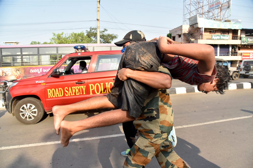 在維沙卡帕特南,一名印度緊急救援人員扛著吸入苯乙烯氣體的男孩,飛奔往救護人員處前進。