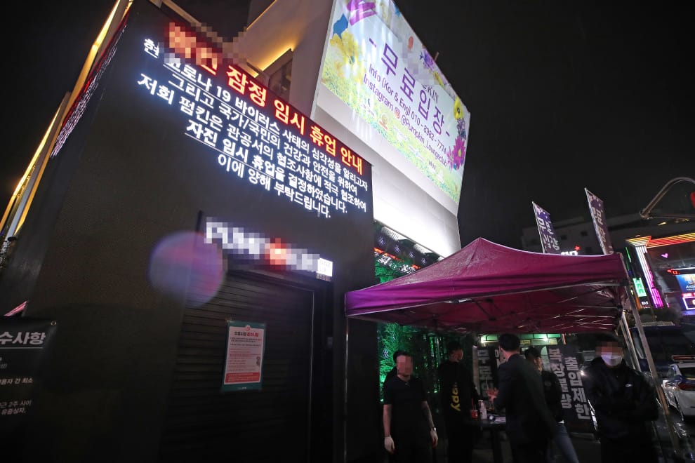 在首爾梨泰院,一家夜店用店外螢幕通知客人,店家在配合政府防疫政策下決定暫時停業。