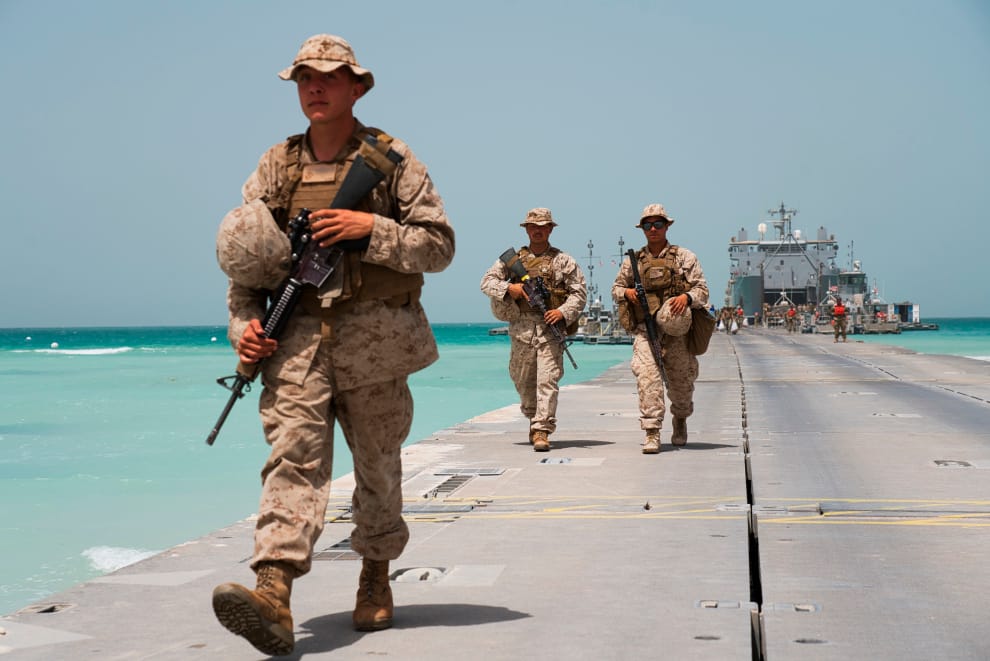 今年 3月23日,美國海軍陸戰隊成員在靠近阿曼灣的地方,與阿拉伯聯合大公國舉行聯合軍演。