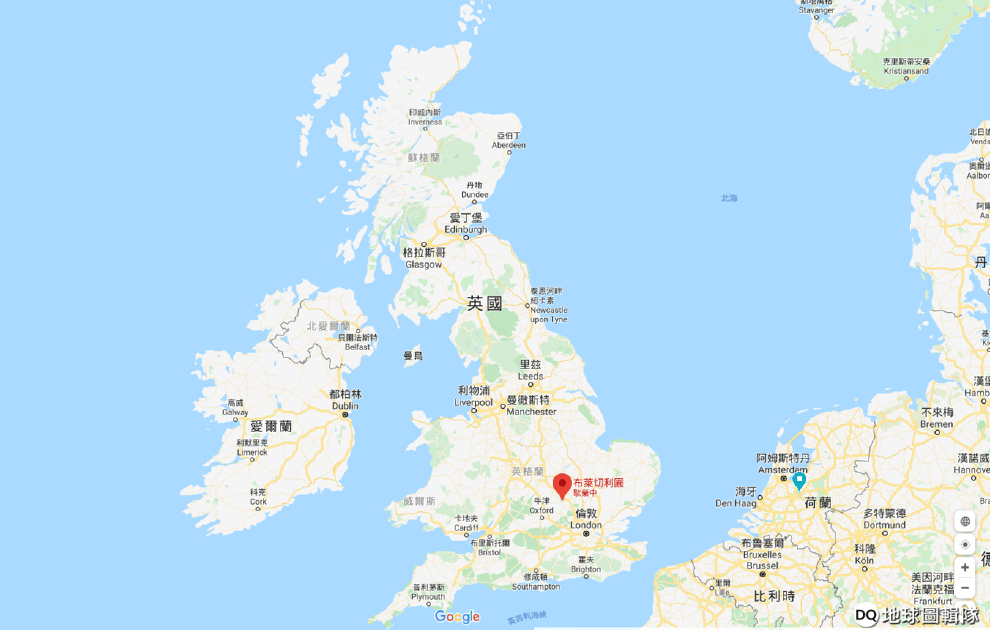 圖中紅標處即為位於倫敦附近,二戰時英國的密碼破譯中心:布萊切利莊園。