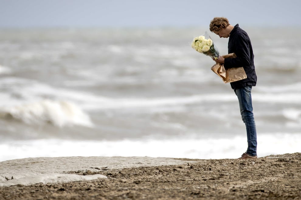 一名男子帶著純白的花束,來到席凡寧根的海岸旁悼念回不來的五名衝浪者。