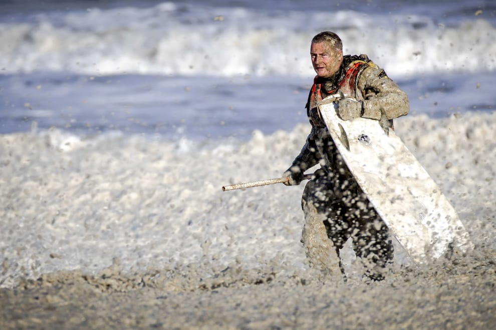 圖為在和泡沫大浪搏鬥的荷蘭海岸警衛隊搜救隊員,這樣的泡沫大浪無疑增加了搜救的難度。