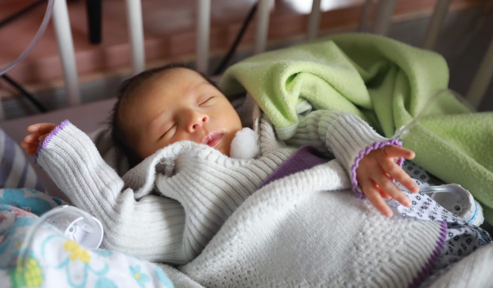 一名被從遭攻擊醫院救出來的嬰兒,安穩地睡在安置醫院的嬰兒床上。