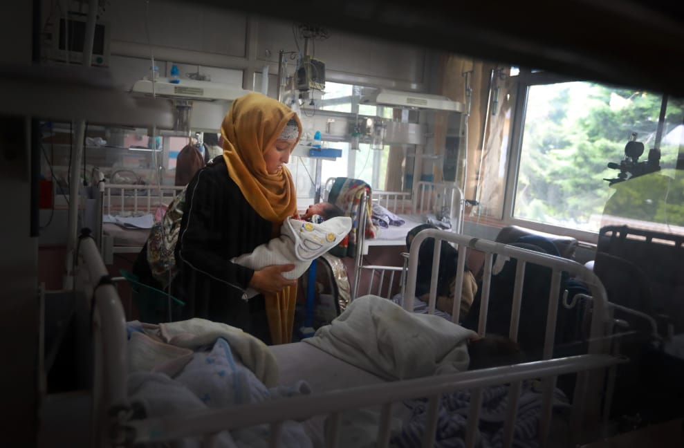 一名在婦產科醫院攻擊事件中倖存的母親,抱起同樣逃過一劫的孩子。