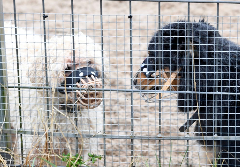 過去,許多飼主不了解該如何照顧進入青春期的狗狗,因而選擇棄養,造成狗狗淪落進入動物庇護所的下場。圖為德國北部的基爾(Kiel),兩隻被歸類為「問題狗」的狗兒被戴上口罩,站在籠內。