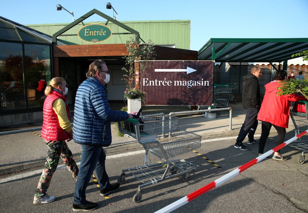 在瑞士西部的格朗市(Gland),民眾戴著口罩,排隊準備進入園藝中心選購。
