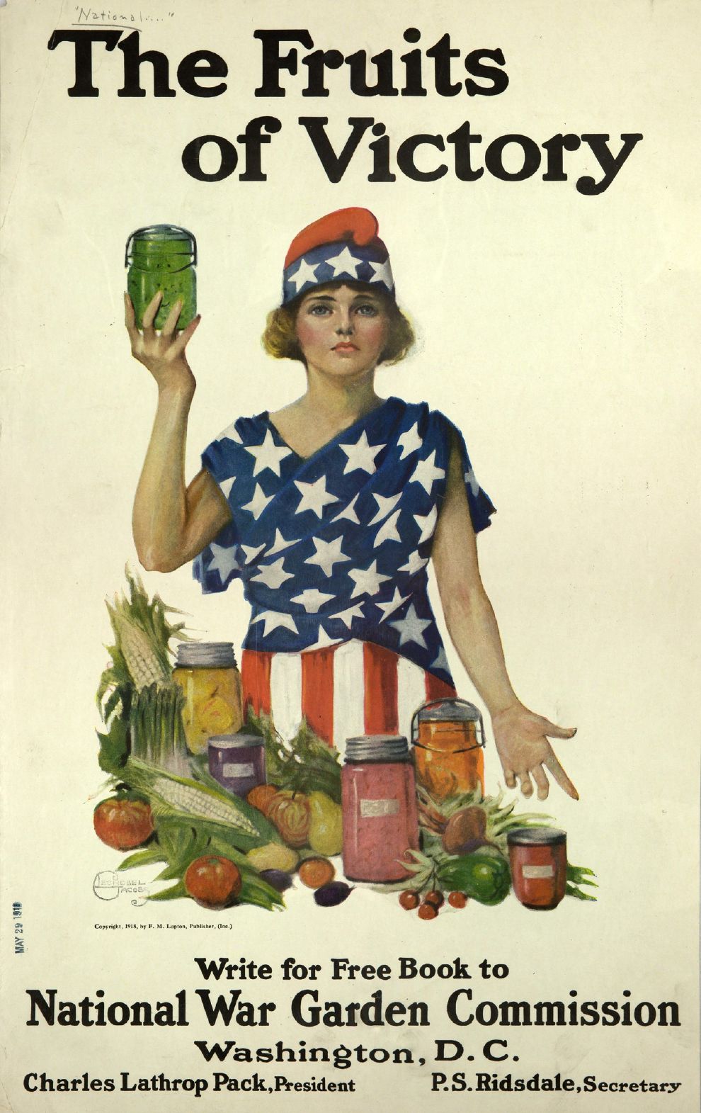 在美國正式加入第一次世界大戰前,美國伐木大亨帕克(Charles Lathrop Pack)在政府的支持下成立了國家戰爭園藝委員會(National War Garden Commission),專門鼓勵和教育民眾投入種植蔬果、自給自足。美國聯邦教育局也不落人後,發起了「美國學校園藝軍計畫」(U.S. School Garden Army),動員學生們在校園空地種菜。