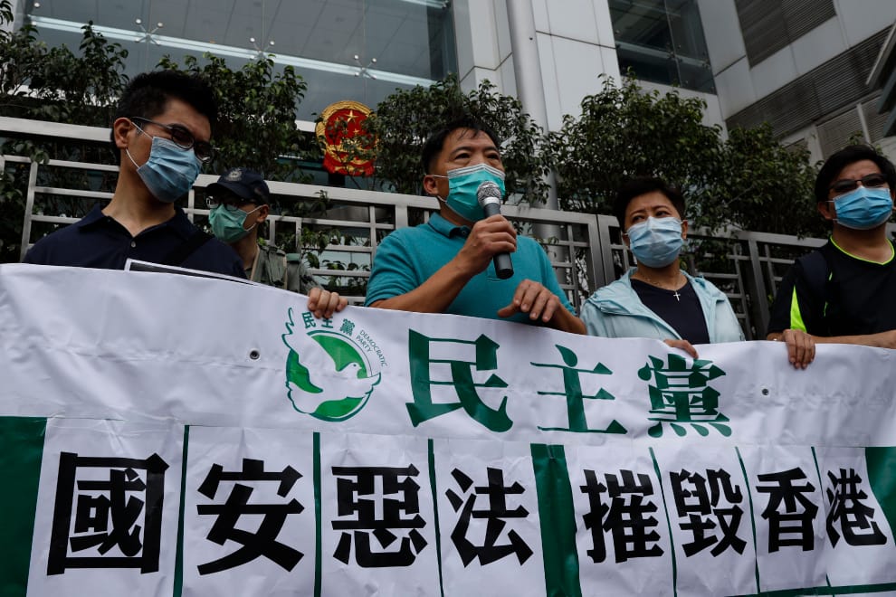 在香港中聯辦前,香港民主黨人士手拉布條抗議「國安惡法摧毀香港」。