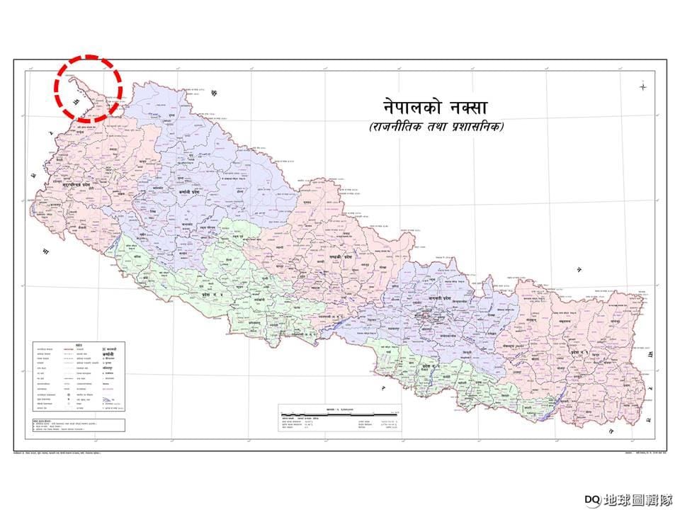 圖為尼泊爾政府公告的新版尼泊爾地圖,左上紅圈處即是尼泊爾與印度爭議領土的大略位置。