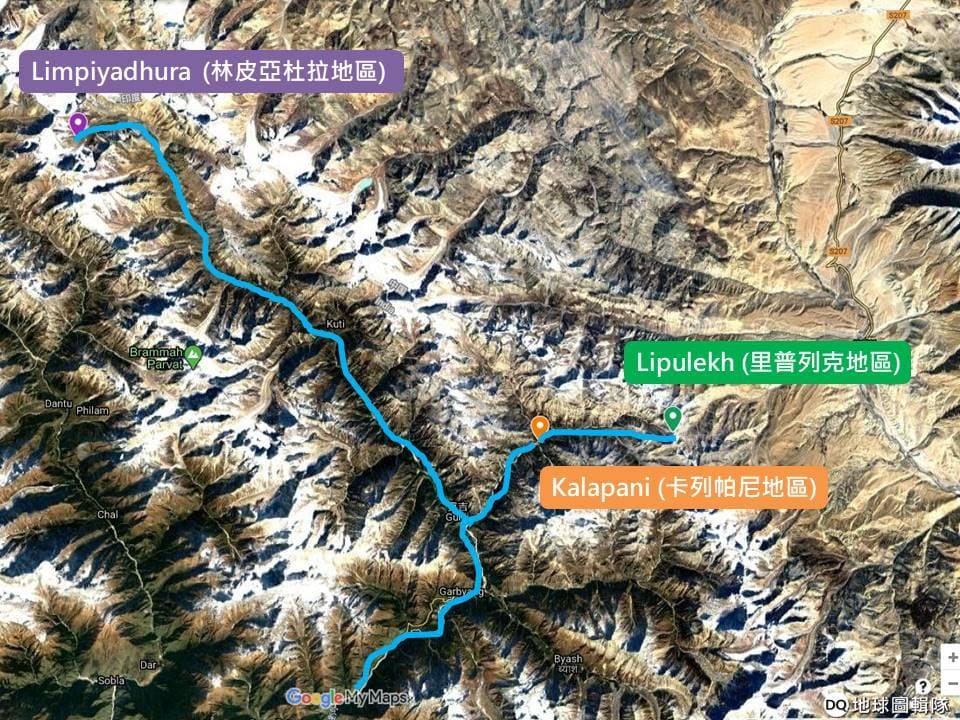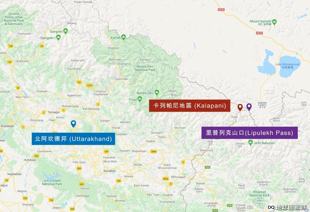 印度北阿坎德邦(Uttarakhand)、爭議領土卡列帕尼地區(Kalapani)、里普列克山口(Lipulekh Pass)的相對位置,公路通往的西藏岡仁波齊峰(Kailash)和三大聖湖之一「瑪旁雍錯」(Mansarovar)則位於地圖右上方。