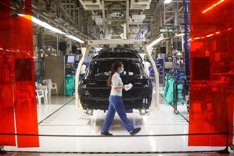 在福斯汽車位於葡萄牙的組裝工廠內,工作人員戴著口罩上班。