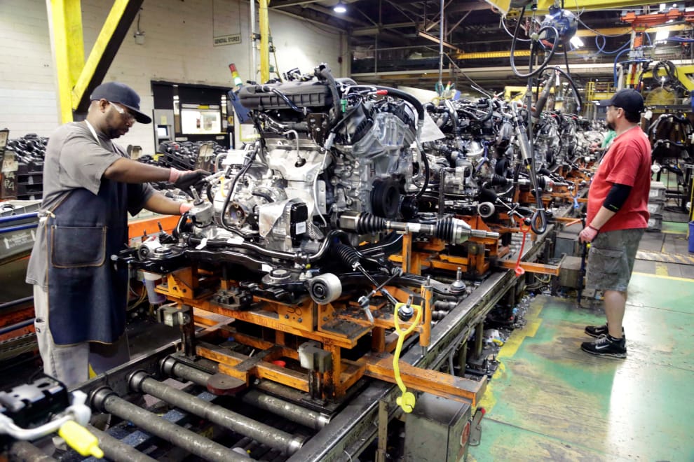 圖為福特汽車公司位於芝加哥的工廠,兩名工人正在生產線上裝配引擎。車內配備的空調系統並不足以升溫到消毒所需要的溫度,因此福特汽車公司打算藉由引擎來協助車內加溫。