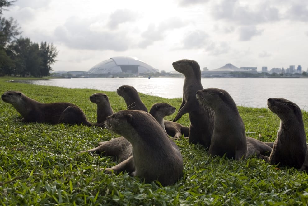 圖為一群在新加坡草地上曬太陽的水獺。在水獺覓食惹人生厭後,社會上出現了要不要「控制」水獺數量的討論。