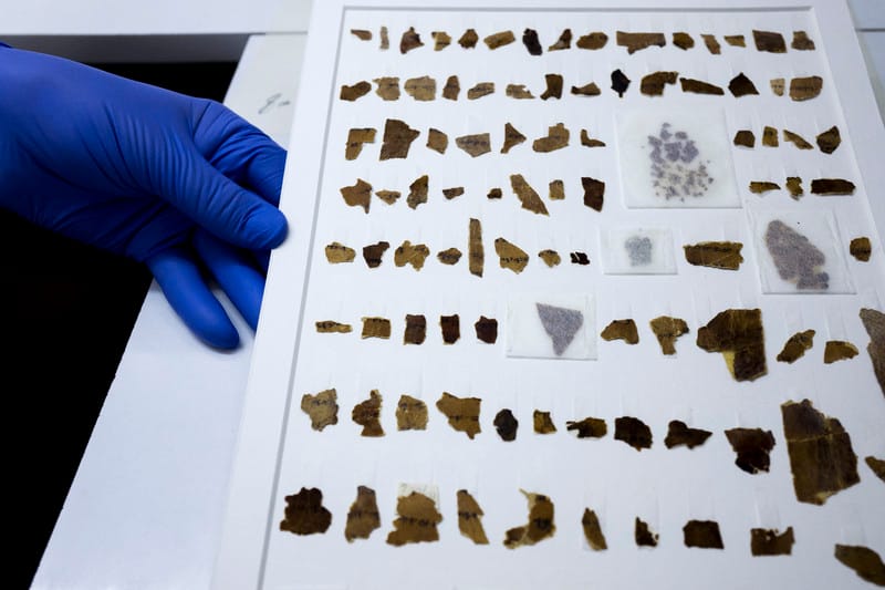 以色列博物館的考古學家拿出一片包含超過 120片《死海古卷》殘片的紙板。