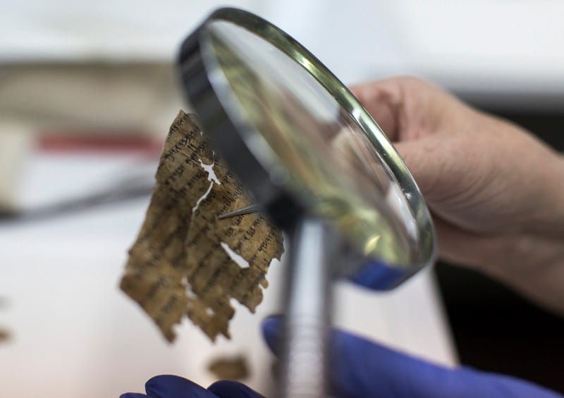 以色列博物館數位實驗室的一名修復員拿著放大鏡,仔細查看一塊《死海古卷》的殘片。