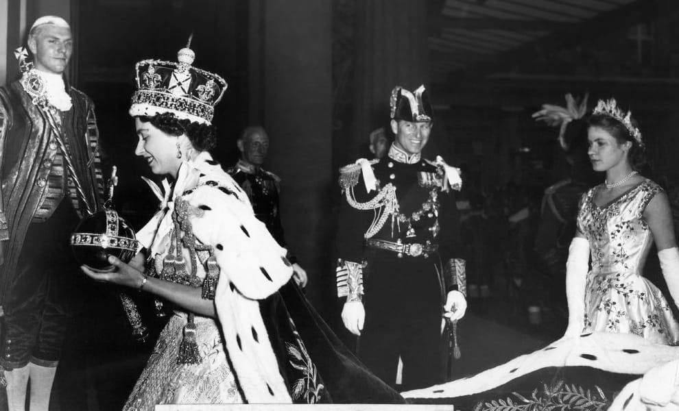 1953年6月2日,剛結束登基儀式的英國女王伊莉莎白二世,一手拿著寶球、一手拿著權杖回到白金漢宮。