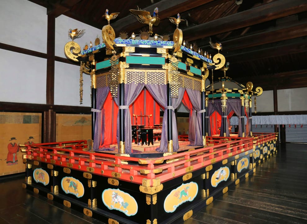 高御座為日本天皇的寶座,是天皇過去在即位、朝覲、接見外國使節時均會使用;皇后則是使用稍微小一點的「御帳台」。