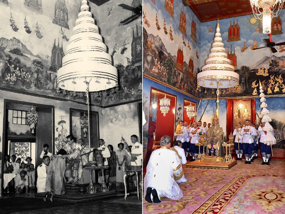 圖左為 1950年,前泰王蒲美蓬的登基畫面;右圖則為 2019年登基的泰王瓦吉拉隆功。