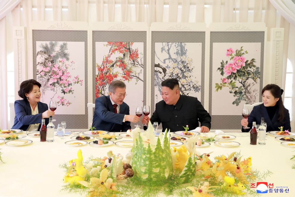 2018年9月時,兩韓領導人舉辦一場會面活動,在午餐會上,金正恩及文在寅相互敬酒。(左一:南韓第一夫人金正淑,左二:現任南韓總統文在寅;右二:北韓領導人金正恩,右一:北韓第一夫人李雪主)