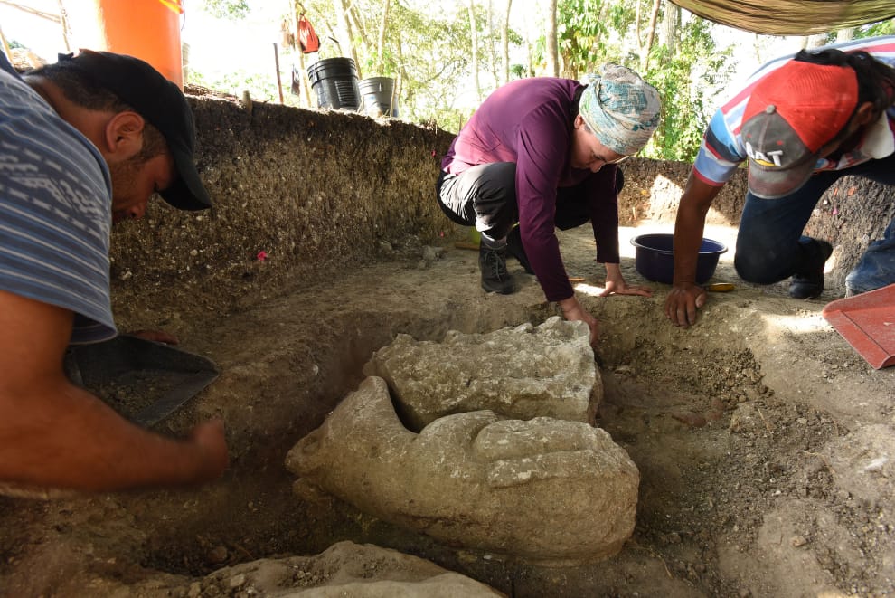 位於畫面中央、身穿紫色長袖的瓦斯克斯,正蹲在地上挖掘Aguada Fénix現場的一尊雕像。