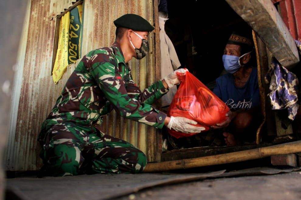 在南蘇拉威西省首府望加錫(Makassar),一名軍人在疫情期間為當地民眾送上緊急援助的食物包。