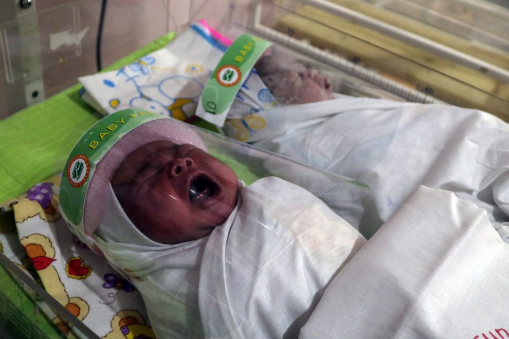 在印尼雅加達的一間醫院內,醫護人員替新生兒戴上了特製的防疫面罩。