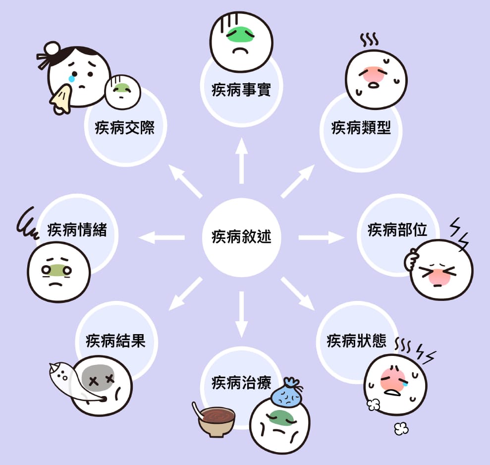 每個分類詞即代表著不同問題意識。例如,當團隊想了解「小說如何描述疾病?」,根據文本內容可以初步分成八類標記,包含疾病情緒、狀態、治療等等,各個標記都能再往下延伸成獨立的研究子題。