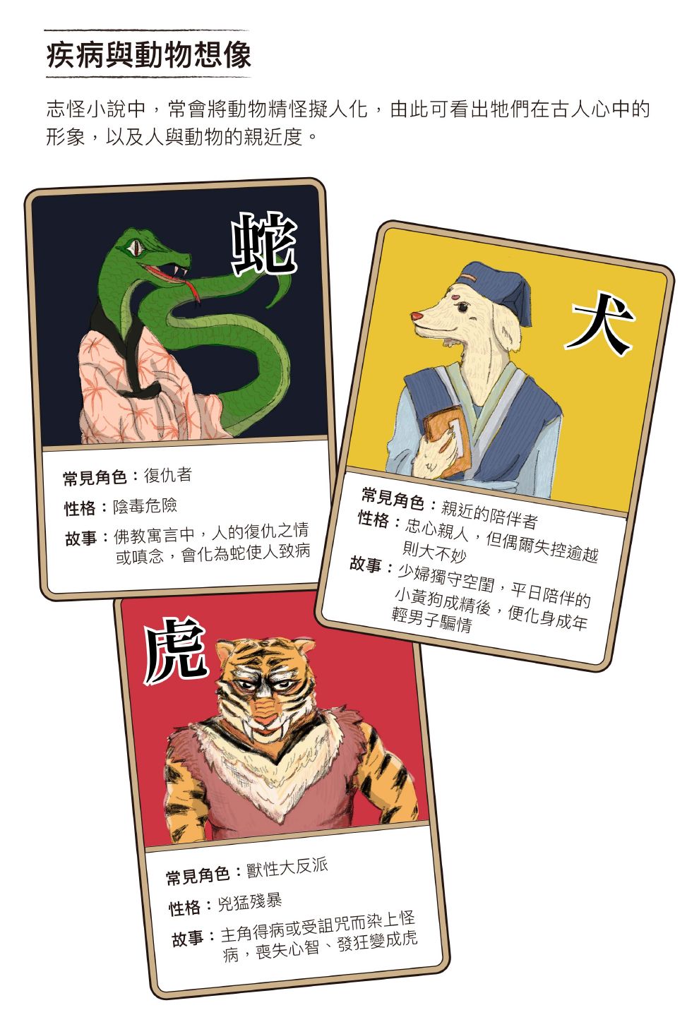 團隊成員邱琬淳分享,志怪文學裡動物是重要元素。動物有時作為一種疾病想像,例如蛇竄入體內致病;有時則是化為精怪,前來報恩或報仇。