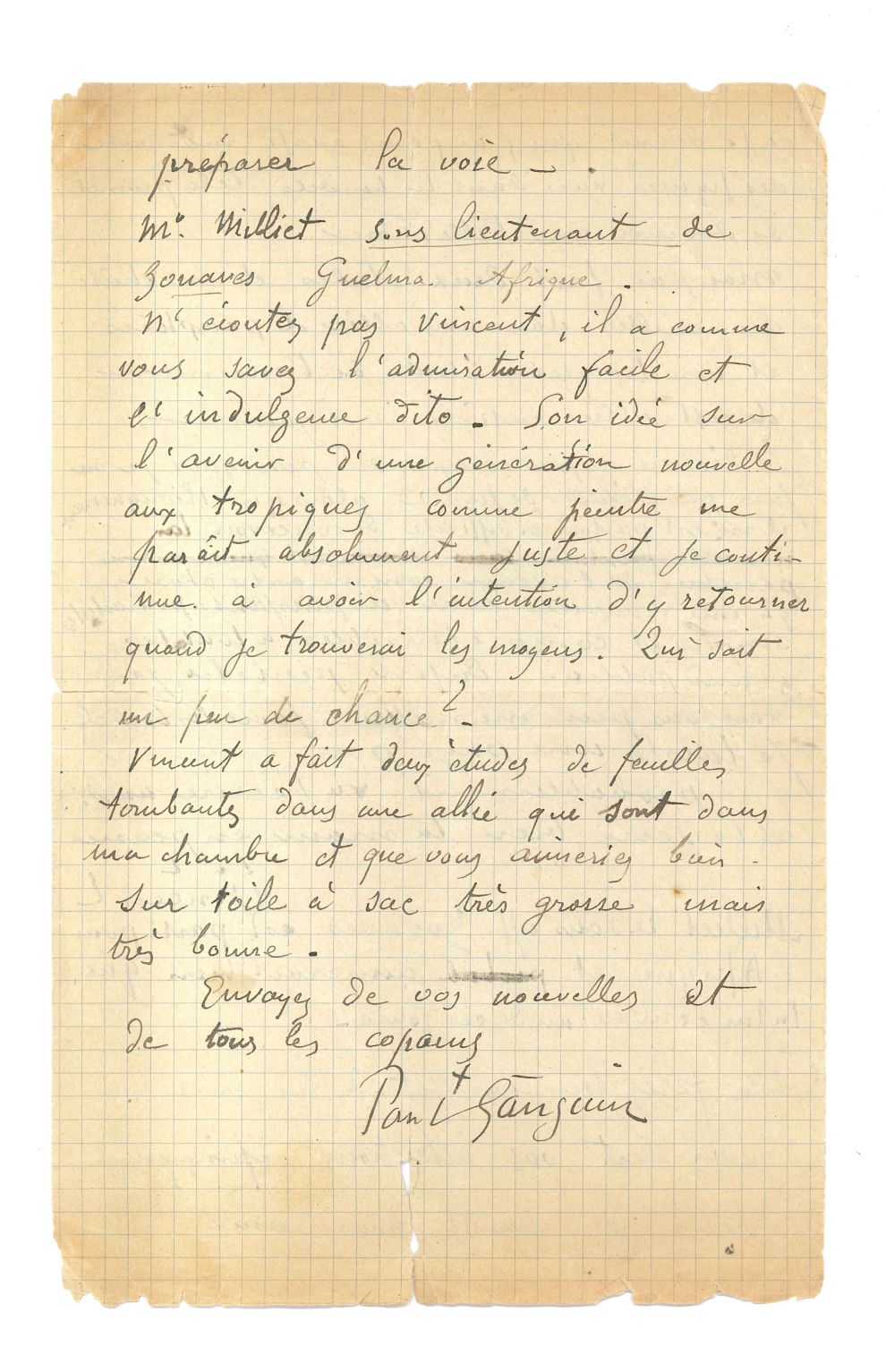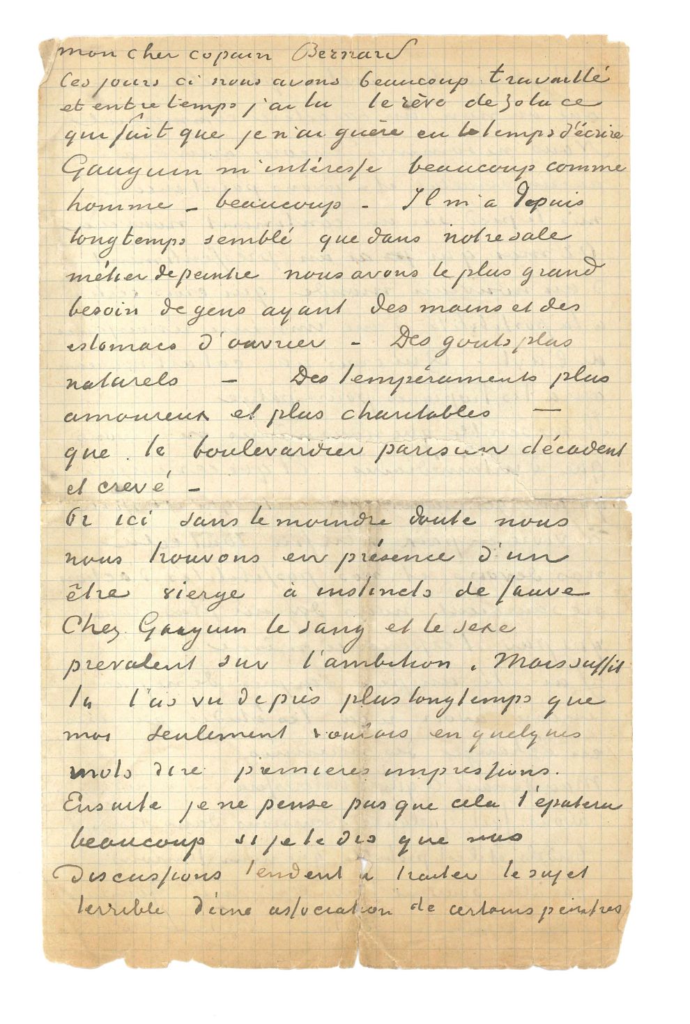 在信中,梵谷首先寫下他對高更的印象,他形容高更「具有野獸的本能,是一個不受外界影響的人」。