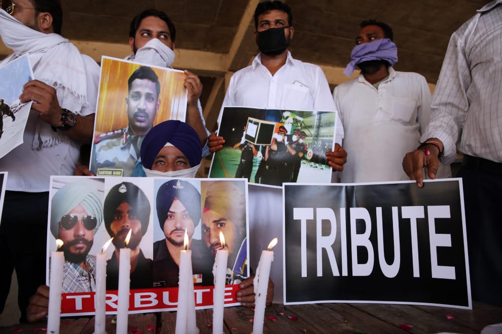 在印度西北部旁遮普邦的阿姆利則市(Amritsar),國家人權與犯罪控制組織的成員手持海報哀悼在中印邊界衝突中喪生的印度軍人。