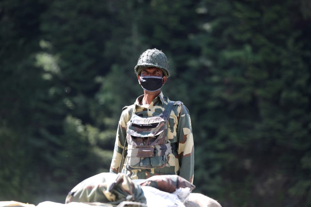 在距離印度查謨和喀什米爾邦的夏季首府斯利那加(Srinagar)81公里的Gagangeer,一名印度軍人站在檢查哨上看守通往拉達克地區的公路。
