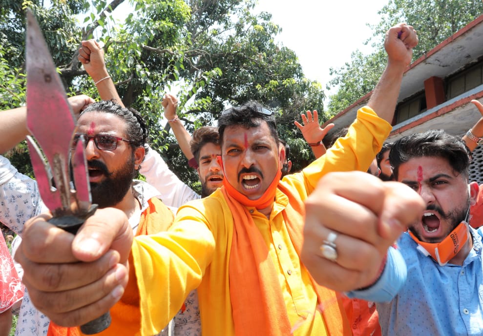 在印度查謨和喀什米爾邦的冬季首府查謨(Jammu),抗議中國攻擊印度軍人的民眾手持匕首,誓言要抵制中國。