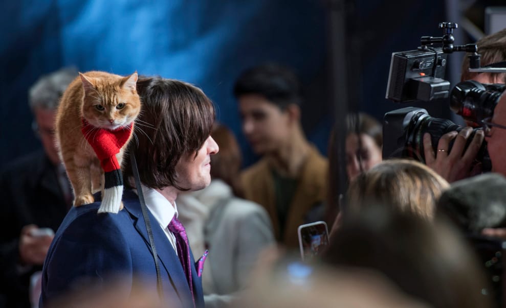 在描寫鮑勃與伯恩的改編電影《遇見街貓BOB》的全球首映會上,伯恩轉頭盯著站在他肩上的老搭檔鮑勃。