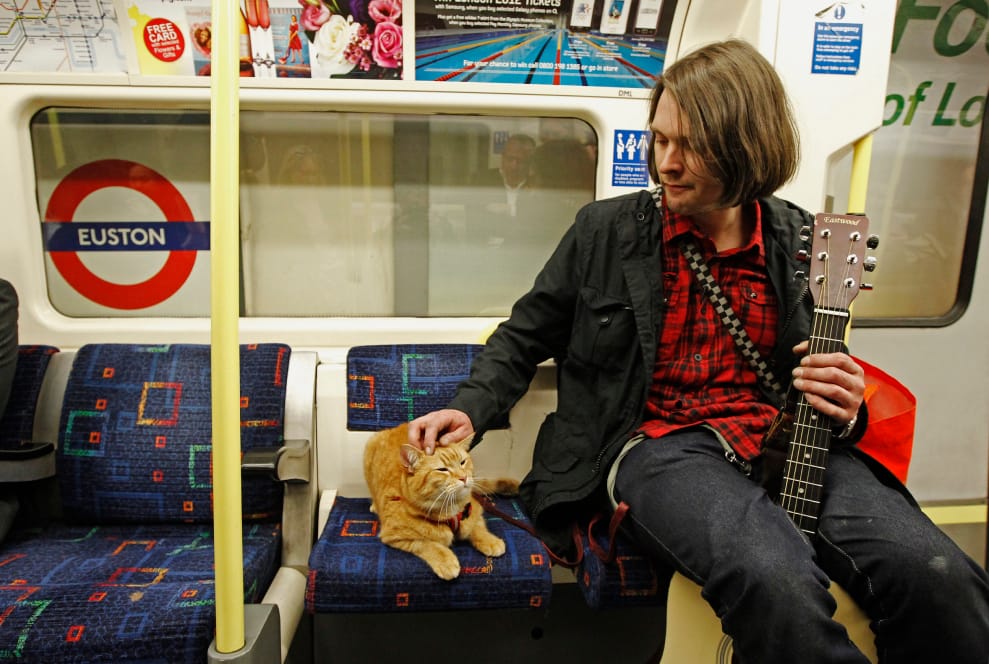 2012年在倫敦地鐵上,伯恩正帶著鮑勃一同旅行。
