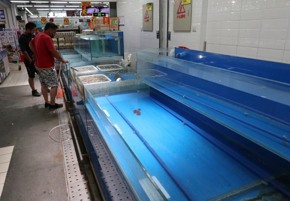 在北京新發地農產品市場爆出疫情後,裡頭過往的人潮不復見,原本裝滿海鮮的水槽也看不到什麼新鮮漁獲。