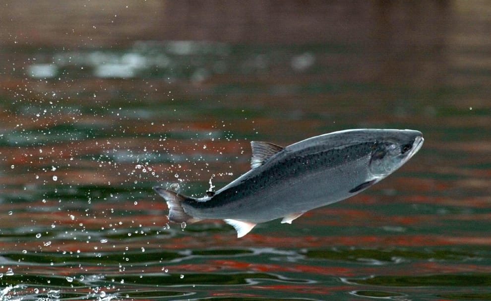 在智利中部的查卡布科省(Chacabuco Province),一隻鮭魚跳出水面。中國的鮭魚大都進口自智利和挪威。