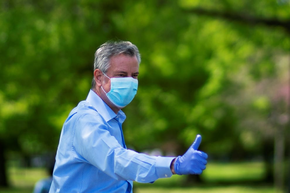 紐約市長白思豪對煙火的消極態度引發市民不滿,在大批民眾上街按喇叭抗議後,紐約市終於宣布將成立跨部會小組處理市內的非法煙火問題, 並將挑四個晚上舉辦國慶日慶祝活動。圖為白思豪出現在紐約市的皇后區(Queens borough),發放口罩給在戶外活動,卻沒戴上口罩的民眾。發放過程中,他朝一位民眾(未在圖中)比出「讚!」的手勢。