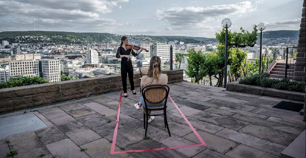 經過多個月的封鎖後,不少德國文化演藝單位紛紛轉戰網路平台。但也有單位堅守線下,兩個樂團舉辦一對一現場音樂服務,由音樂家與聽眾對望一分鐘後,為聽眾帶來長約 10分鐘的表演。