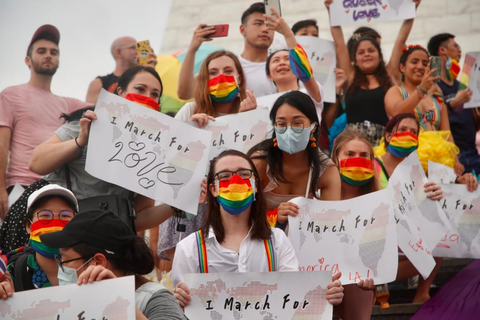 在COVID-19(武漢肺炎)疫情全球蔓延,各國紛紛取消大型活動下,台灣LGBT驕傲大遊行周日(28)在台北市登場,讓自由廣場充滿飄揚的彩虹旗,一起慶祝國際同志驕傲月。