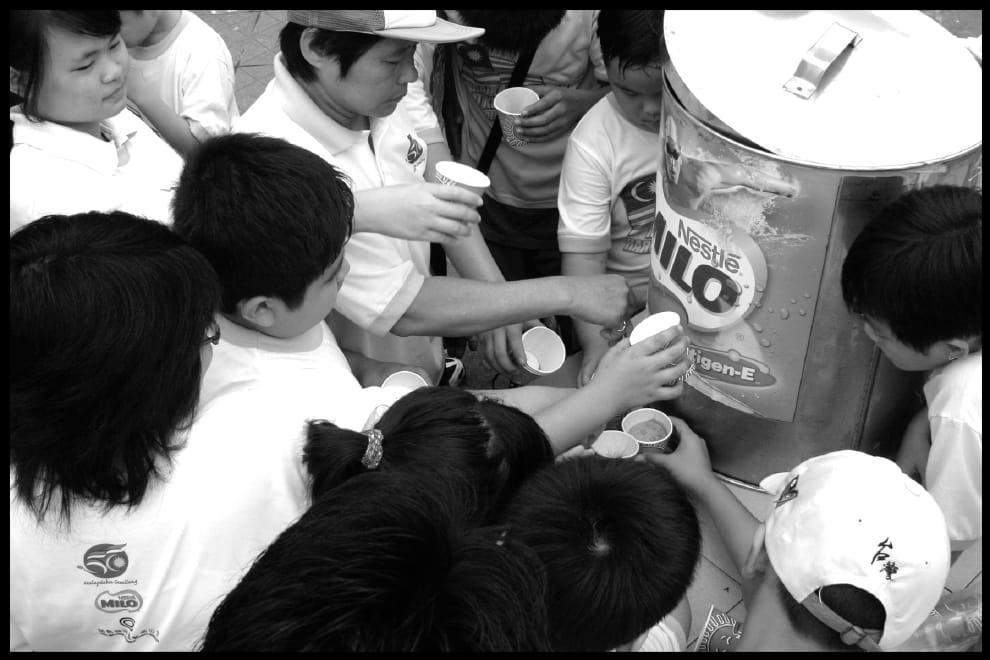 圖為人們在馬來西亞爭喝美祿的畫面。在美祿剛進馬來西亞市場時,瑞士雀巢公司將它包裝成「營養補給品」,針對小孩和長輩行銷。