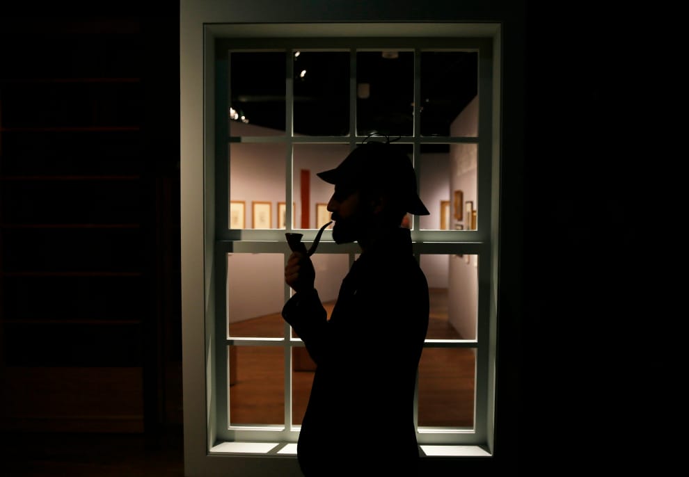 道爾基金會宣稱,Netflix、斯普林格及蘭登書屋都沒有來洽談版權就擅自使用「溫暖的福爾摩斯」這個角色,使他們決定向上述三者發起訴訟。圖為英國倫敦一場福爾摩斯展覽會場上,策展人隆恩(Timothy Long)打扮成福爾摩斯的樣子,站在會場一扇窗戶前。