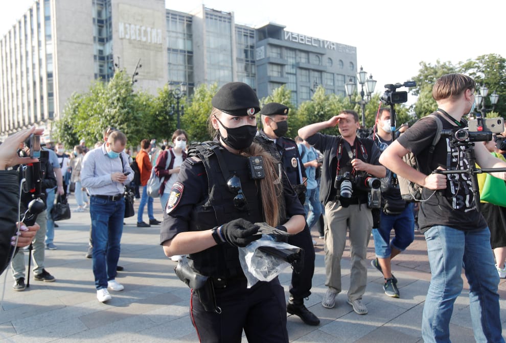 圖為在莫斯科抗議現場發放口罩的警察。因為疫情的關係,參與反修憲示威活動的民眾並不多。