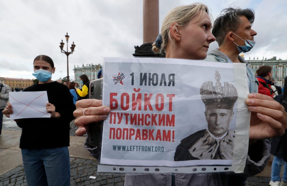 在聖彼得堡的冬宮前,反對修憲公投的民眾拿著將普亭描繪成國王的海報,上頭寫著「抵制普亭修憲」。