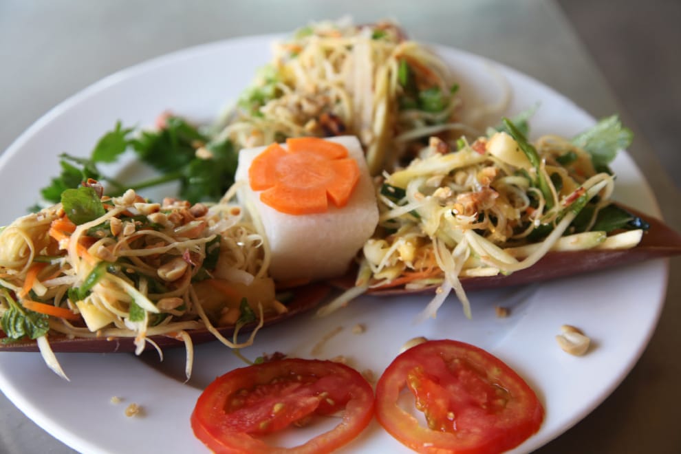 在寮國,青木瓜沙拉叫做Tam Bak Hoong,直翻就是「搗爛的木瓜」,人們會用當地尚未成熟、還綠綠的芒果、青木瓜或小黃瓜當作主角,再增添酸辣的配料一起製作清爽開胃的沙拉。