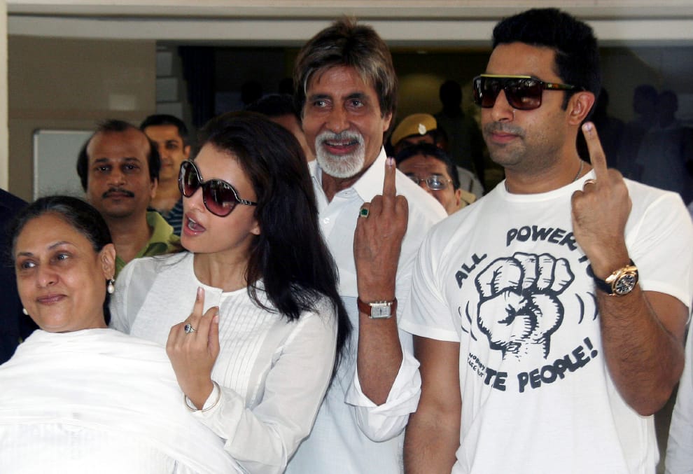 圖為阿米塔布巴占一家,這一家人都是寶萊塢著名影星,由左至右分別是阿米塔布巴占的妻子賈雅巴占(Jaya Bachchan),媳婦艾絲維亞雷巴占,阿米塔布巴占和兒子阿彼錫巴占。圖為他們一家在 2009年參加國會大選,投完票後對著鏡頭亮出沾有印泥的指頭。