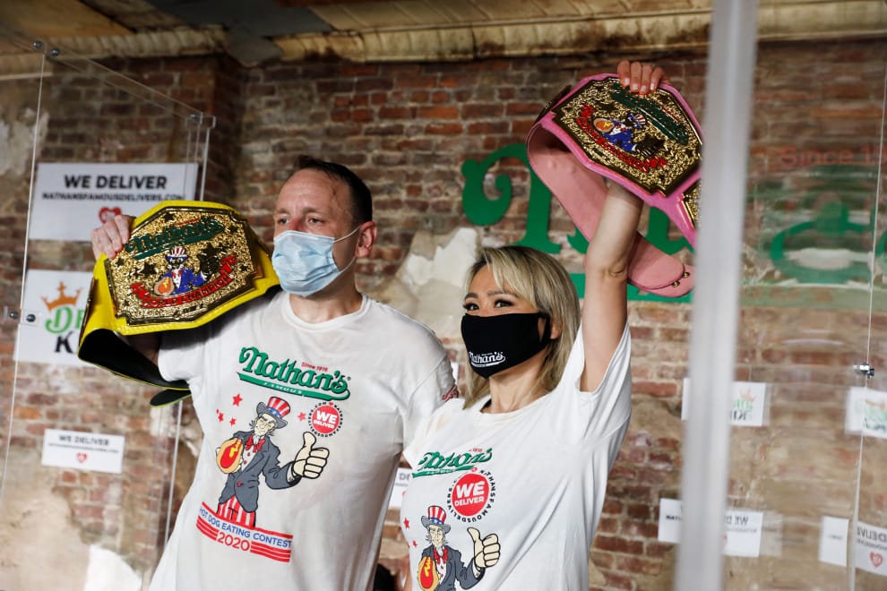 今年奈森熱狗大胃王比賽的男子組與女子組冠軍,再度由「大白鯊」切斯納特(左)和須藤美貴拿下。