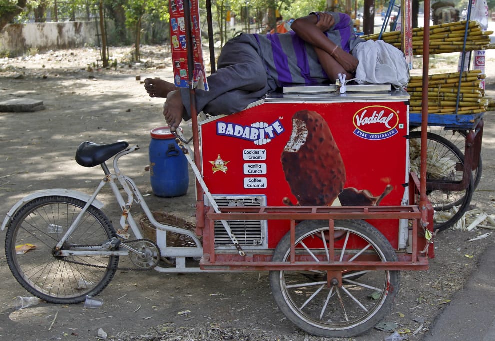 對印度大城海德拉巴的攤販們來說,找到一塊小小樹蔭休息、做生意,逐漸成為一種奢侈的享受。圖為印度大城安拉阿巴德市(Allahabad)一名在樹蔭下小睡的攤販。